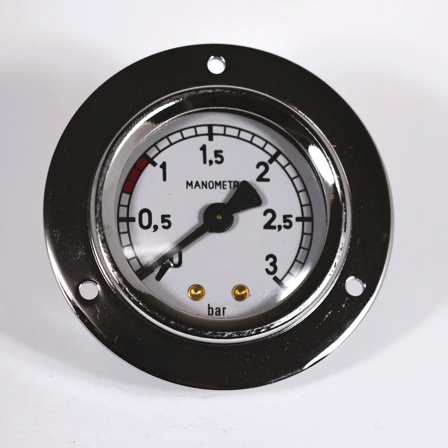 Single scale 0-3 bar. Fittings 1/8''M. Body DIA 53mm. Frame DIA 71mm. Frontal fixing with 3 holes DIA 3.5mm. For coffee machines Bianchi (LUCIA), Faema (E61), Fiorenzato C.S. (PIAZZA SAN MARCO), Gem Futurema.