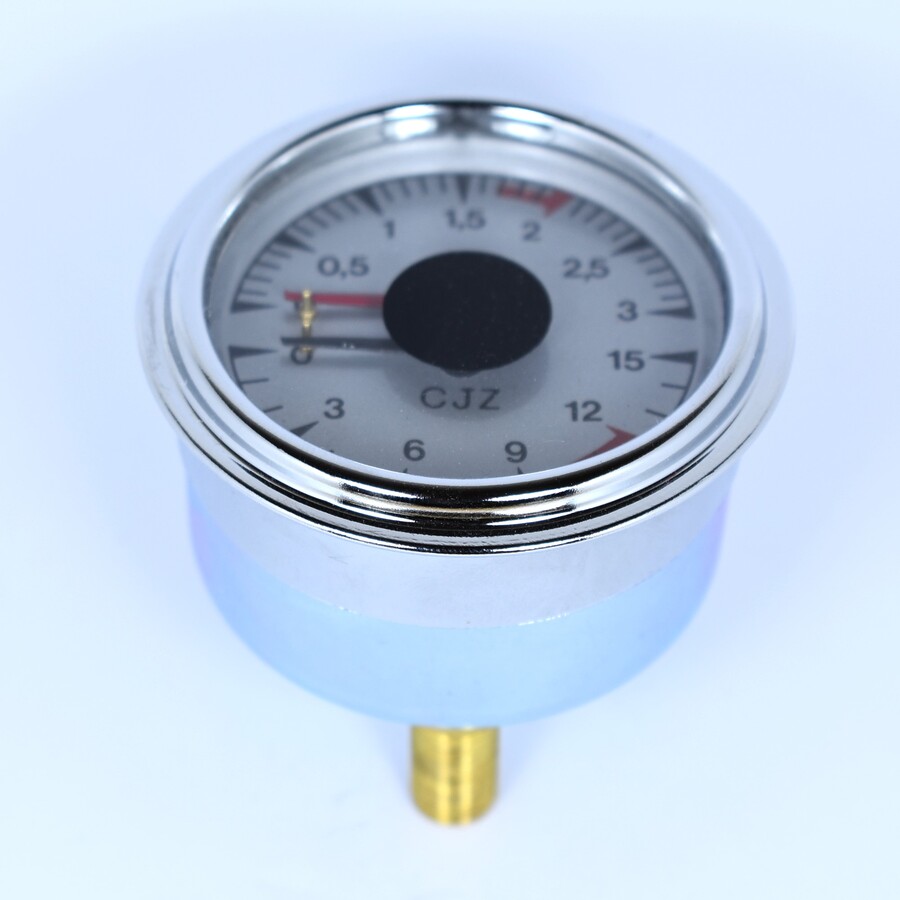 Double scale 0-3 bar / 0-15 bar. Fittings 1/8"M. Body DIA 60mm. Frame DIA 66mm. Metal box. For coffee machines Wega, Astoria, others.