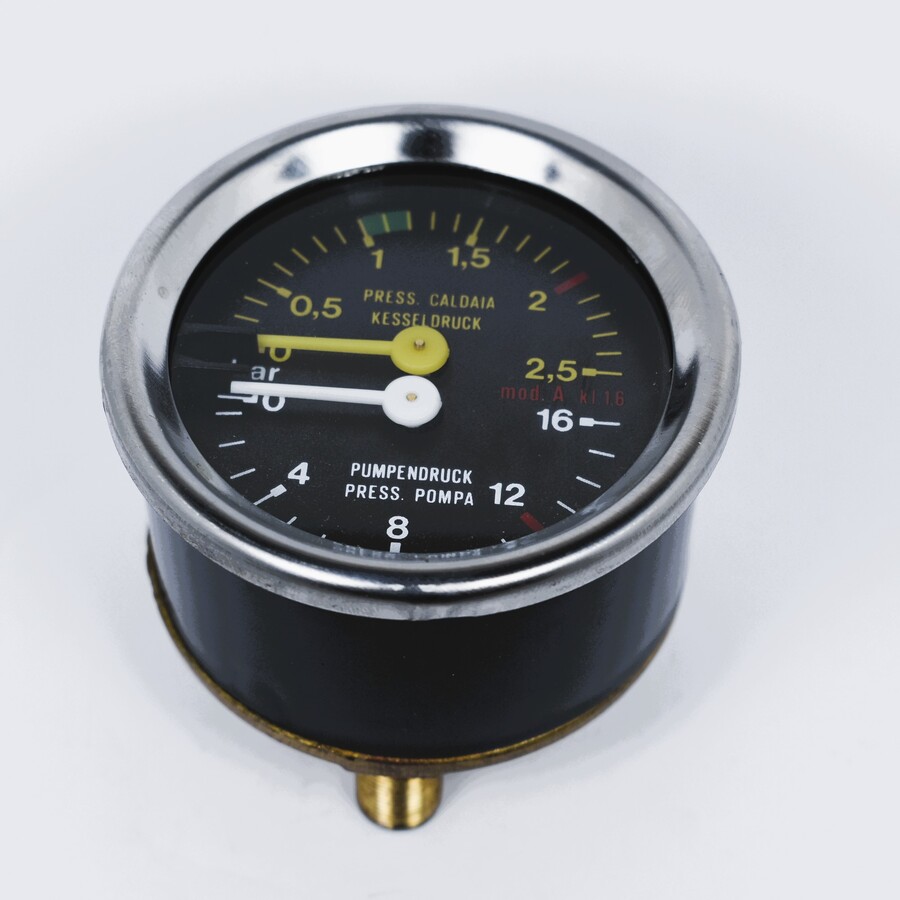 Double scale 0-2.5bar / 0-16bar. Fittings 1/8. Body DIA 60mm, Frame DIA 65mm. For Astoria CMA (ARGENTA), Aurora-Brugnetti, Nuova Simonelli (MACCUP), Pavoni (BAR, BART, PUB), Spaziale (RAPID ,SPAZIO), Wega (AIRY, ANTARES, ATLAS, COMBINOVA, FORMULAMILANO, NOVA, NOVA COMPATTA ,NOVA MILANO, ORION, POLARIS, SEPHERA).